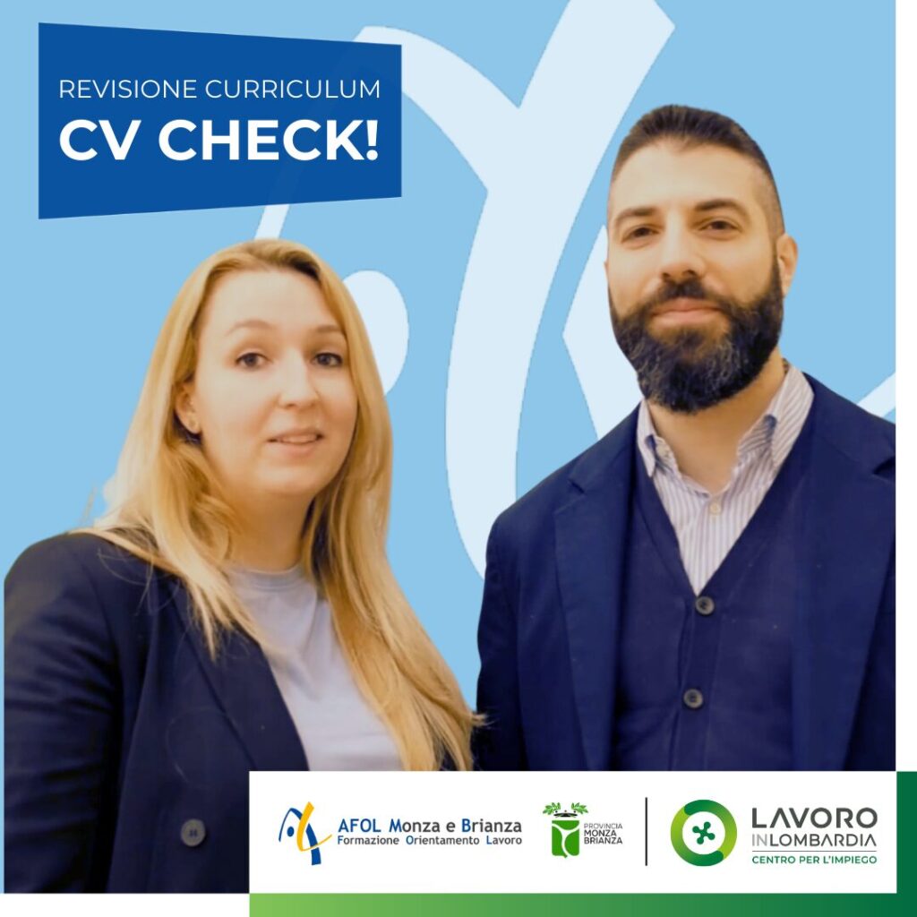 Consigli ed errori da evitare per avere un Curriculum perfetto: ti aspettiamo al Palazzo del Lavoro di Monza per rivedere insieme il tuo CV! Per partecipare, compila il form e ti ricontatteremo: clicca qui Gli appuntamenti sono previsti tutti i giovedì mattina. Per saperne di più:mail l.cancellara@afolmb.it oppuretel. 039.839641